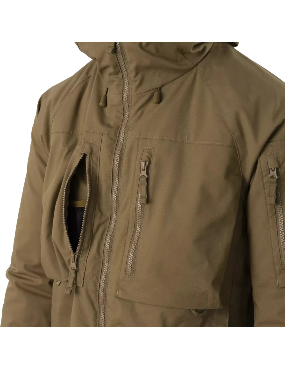 Sie verfügt über Funktionen, die die Nutzung im Gelände erleichtern, darunter Belüftungsreißverschlüsse unter den Armen für schnelle Wärmeabgabe, eine große verstellbare Kapuze, unter die problemlos eine Mütze oder ein Hoodie passt, Paracord-Schlaufen in den Taschen zum Befestigen kleiner Ausrüstung sowie MOLLE/PALS-Schlaufen am unteren Rand zum Anbringen weiteren Equipments.