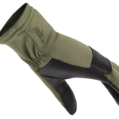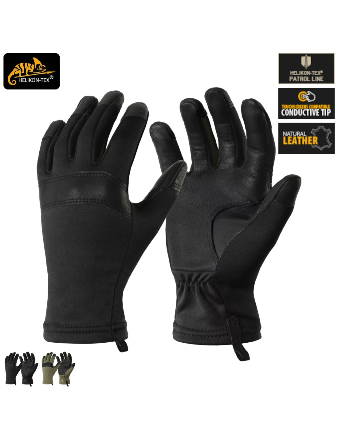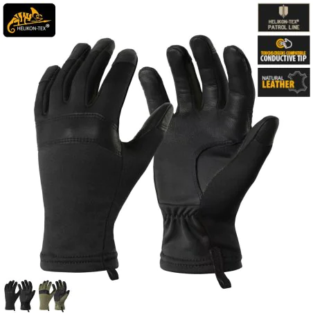 Patrol Gloves by Helikon-Tex are modern gloves designed for military-style operations. Made from a combination of flexible synthetic material and natural leather, they offer both comfort and functionality. The anatomical cut, extending past the wrist, together with a shirt cuff, provides secure protection and high wearing comfort. Compatible with touchscreen devices, these gloves allow you to operate devices without removing them. Leather inserts on the palm, fingertips, and along the knuckles enhance protection and reinforce the glove structure. Properly maintained, the natural leather will remain durable and attractive for years. Elastic rubber on the outside of the wrist ensures a snug fit, while small stitched loops allow you to attach the gloves to a carabiner or belt. Please note that due to the natural origin of the leather, individual pieces may vary in texture and appearance.