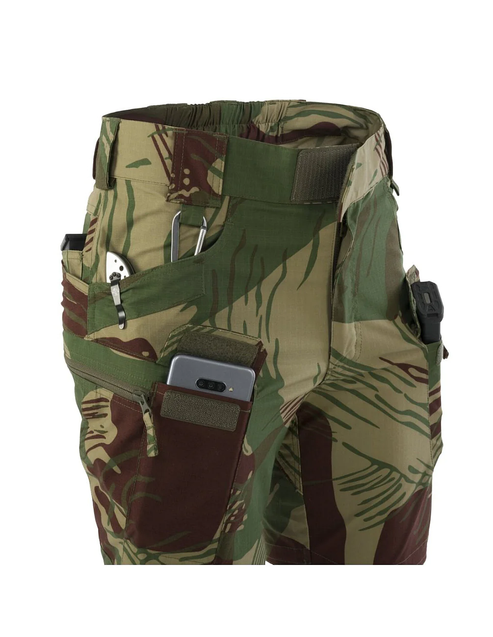 Urban Tactical Shorts® (UTS®) from Helikon-Tex® are the perfect choice when it's really hot and you need the tactical functionality of your favorite UTP® pants. UTS® is an urban, tactical shorts version of the popular bestseller. Thanks to the cut and pocket placement, the shorts maintain a civilian look without revealing the user's identity. The design of UTS® allows for carrying essential equipment, while the cut perfectly adapts to the body's movements. The elastic waistband and Velcro closure make it easy to adjust the shorts. The large belt loops enable the use of wide belts such as EDC, UTL®, or Cobra®. Additionally, the back part of the shorts, designed like jeans, prevents them from slipping during use. Thoughtfully arranged pockets allow for the convenient placement of equipment near the center of gravity - around the hips and waist. The edges of the front and back pockets are reinforced to withstand the intense insertion of knife clips or flashlights. Two front thigh pockets with Velcro closure are perfect for carrying a smartphone, but they are spacious enough to accommodate even an AR/AK magazine. The side zipper-closed thigh pockets may appear flat at first glance, but their construction allows for carrying larger items such as a wallet or pouch. A wide range of colors allows you to choose the right version of the shorts to match the working conditions and other wardrobe pieces.