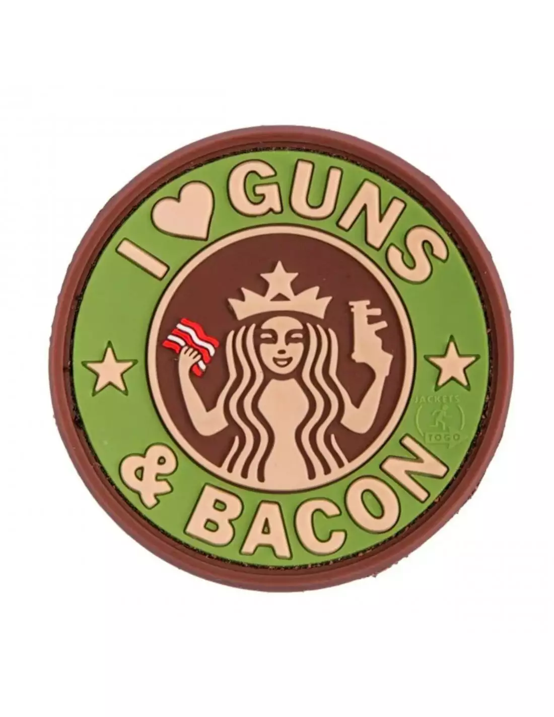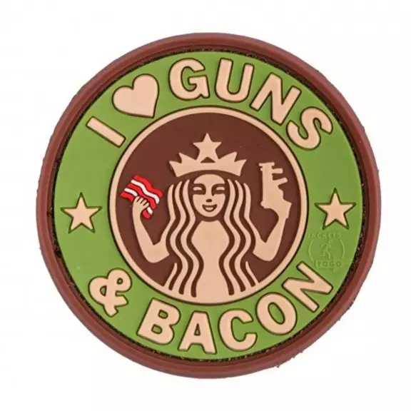 Gumowa naszywka JTG® na rzep Guns and Bacon 3D. Z tyłu znajduje się powierzchnia na rzep, która jest przyszyta do naszywki. Dzięki temu można go przymocować do dowolnej pętelkowej powierzchni zapinanej na rzep.